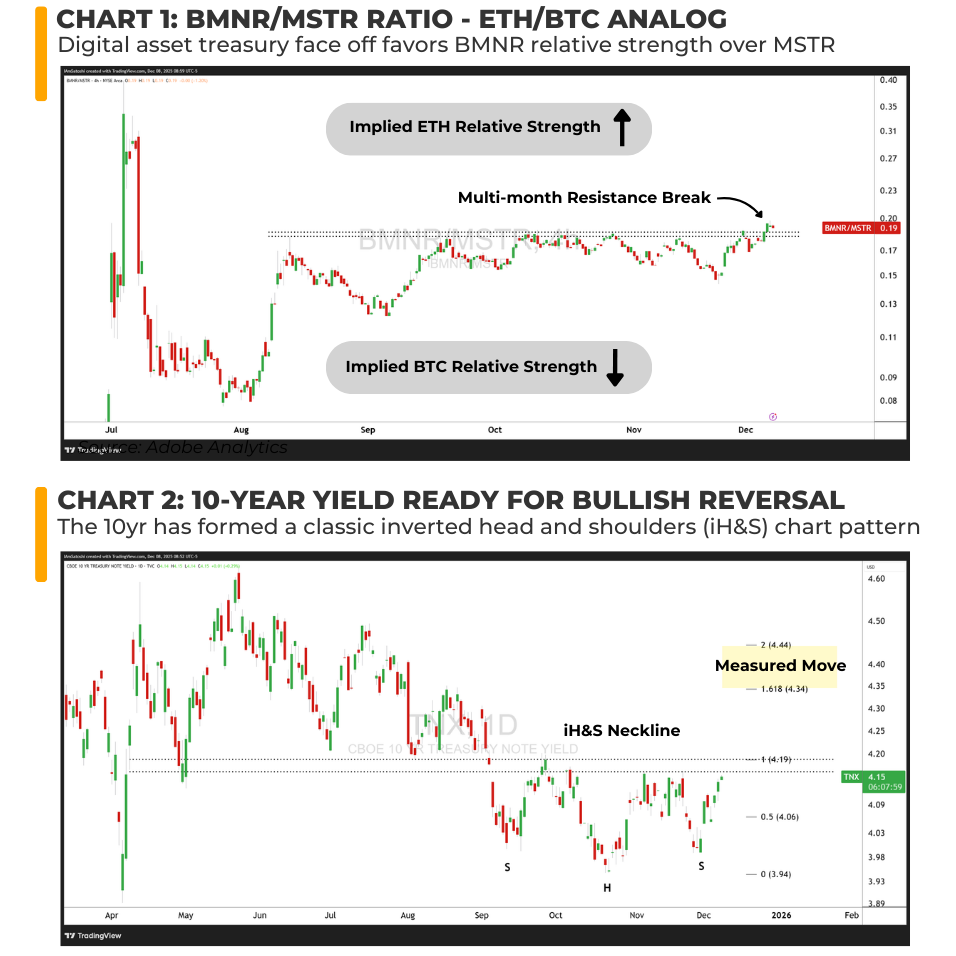 Bonds, however, seem ready to challenge any dovish tilt. Both the 2-year and 10-year yields are forming inverted head-and-shoulders patterns, typically pointing to higher yields. Bond markets may assert themselves across the curve if the Fed sounds too relaxed about inflation, which remains slightly above the 2% target. If investors believe the Fed is not treating inflation seriously, bonds could spoil the equity and crypto party by reminding everyone who is in charge.