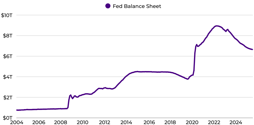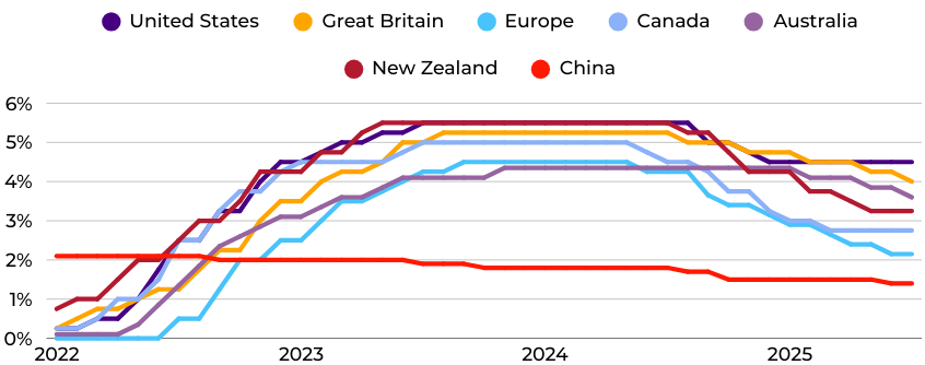 With inflation now in the 2–3% range and unemployment edging higher, the Fed has paused its rate cuts. Global data points to a slowing economy, prompting other central banks to ease policy. The UK lowered rates earlier this month, the fifth cut since August last year, bringing them to their lowest level in over two years. The ECB began cutting in 2024, reducing rates eight times to the current 2.15%. China has been cutting since 2021, now holding rates at 3% while also buying assets. In contrast, the Fed has kept rates at 4.25%–4.50% since November 2024, while maintaining QT.